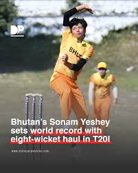 - Bhutan spinner Sonam Yeshey created history by becoming the first bowler to take eight wickets in a men’s T20 International match.