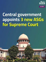 - In India’s legal and constitutional framework, the Central Government has appointed three senior advocates as Additional Solicitors General (ASGs) to represent the Union before the Supreme Court of India.