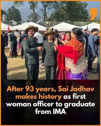 - At just 23 years of age, Sai Jadhav has created history by becoming the first woman officer to graduate from the Indian Military Academy (IMA), Dehradun.