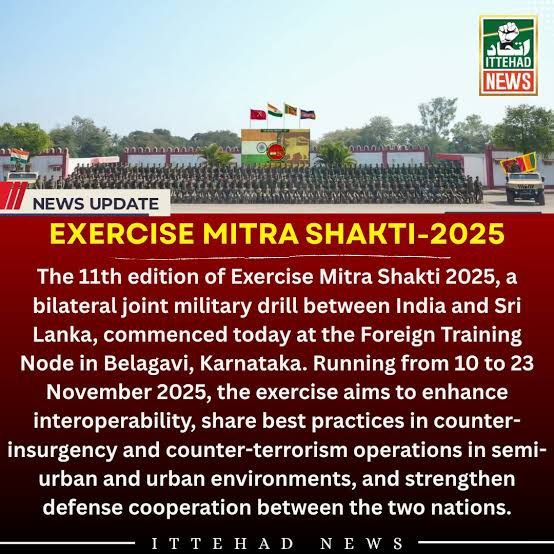 The 11th edition of Exercise Mitra Shakti 2025, a bilateral joint military drill between India and Sri Lanka, commenced today at the Foreign Training Node in Belagavi, Karnataka. Running from 10 to 23 November 2025, the exercise aims to enhance interoperability, share best practices in counter-insurgency and counter-terrorism operations in semi-urban and urban environments, and strengthen defense cooperation between the two nations.