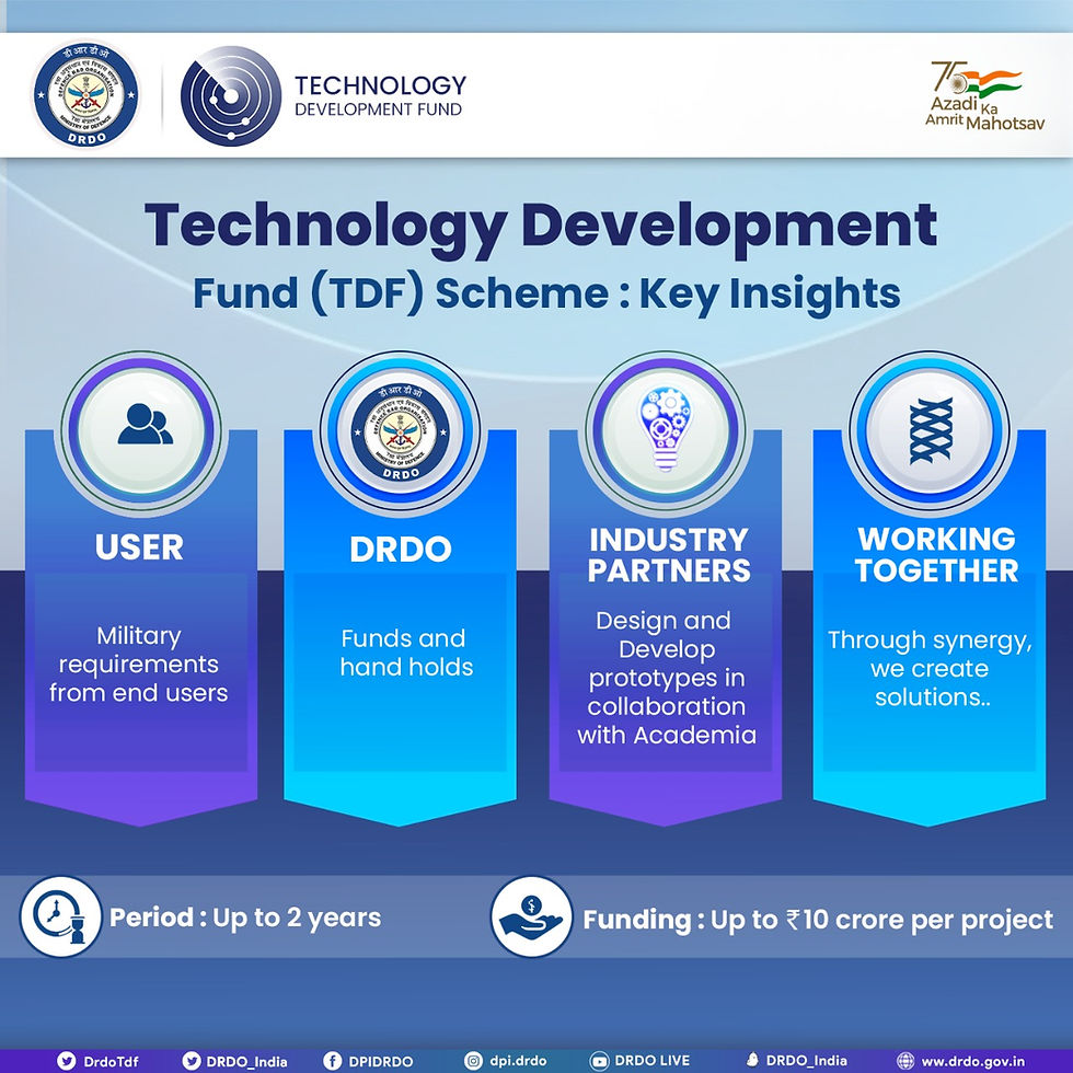 - ਹਾਲ ਹੀ ਵਿੱਚ, ਰੱਖਿਆ ਖੋਜ ਅਤੇ ਵਿਕਾਸ ਸੰਗਠਨ ਨੇ ਤਕਨਾਲੋਜੀ ਵਿਕਾਸ ਫੰਡ (TDF) ਸਕੀਮ ਅਧੀਨ ਵਿਕਸਤ ਸੱਤ ਤਕਨਾਲੋਜੀਆਂ ਹਥਿਆਰਬੰਦ ਬਲਾਂ ਨੂੰ ਸੌਂਪੀਆਂ ਹਨ।