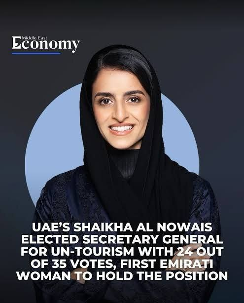 UAE'S SHAIKHA AL NOWAIS ELECTED SECRETARY GENERAL FOR UN-TOURISM WITH 24 OUT OF 35 VOTES. FIRST EMIRATI WOMAN TO HOLD THE POSITION.